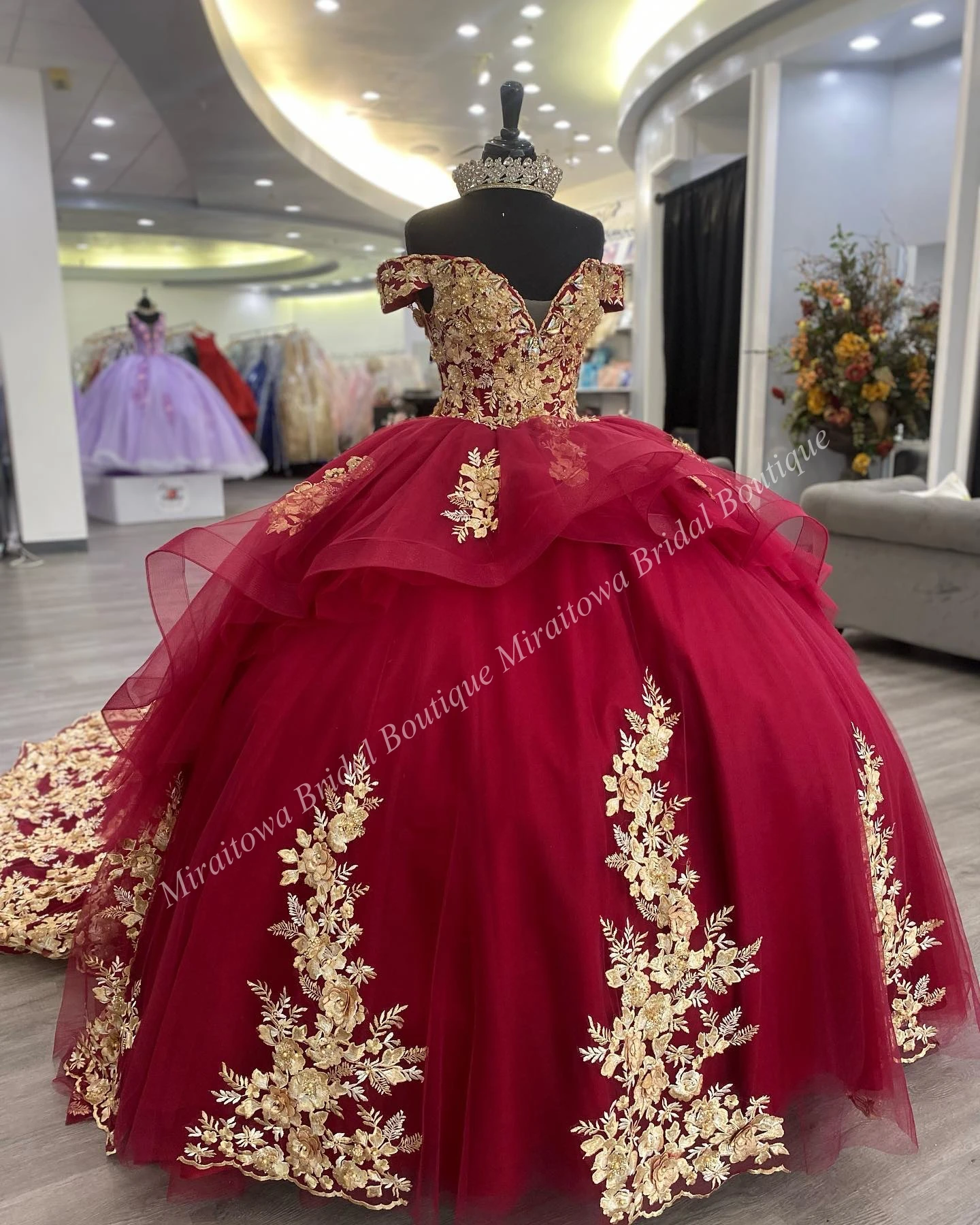 Red Princess Long Train Quinceanera Dress 2024 Ball Gown Off The